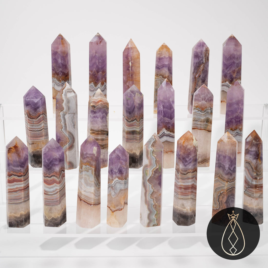 Each tower in this collection is selected for its unique color bands, clarity, and structure—from vibrant fluorite to glowing labradorite.