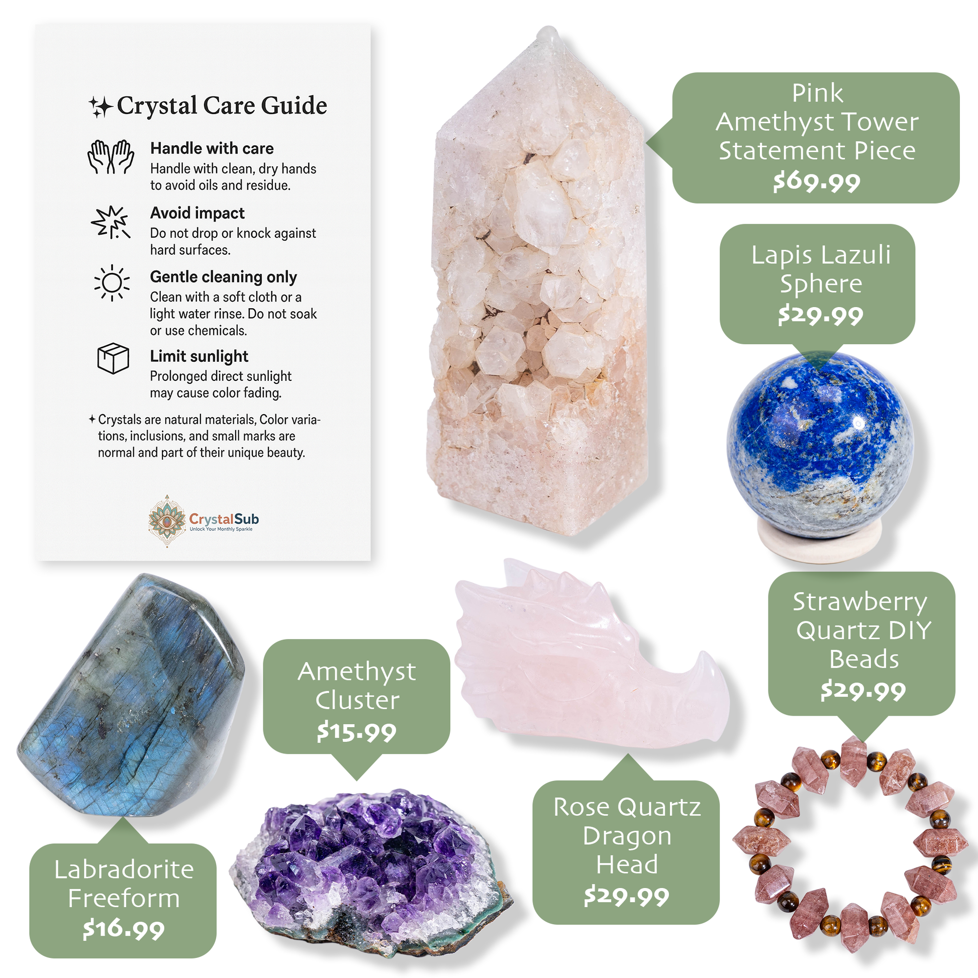 CrystalSub Box is a monthly crystal subscription designed to bring intention, beauty, and positive energy into your daily life.