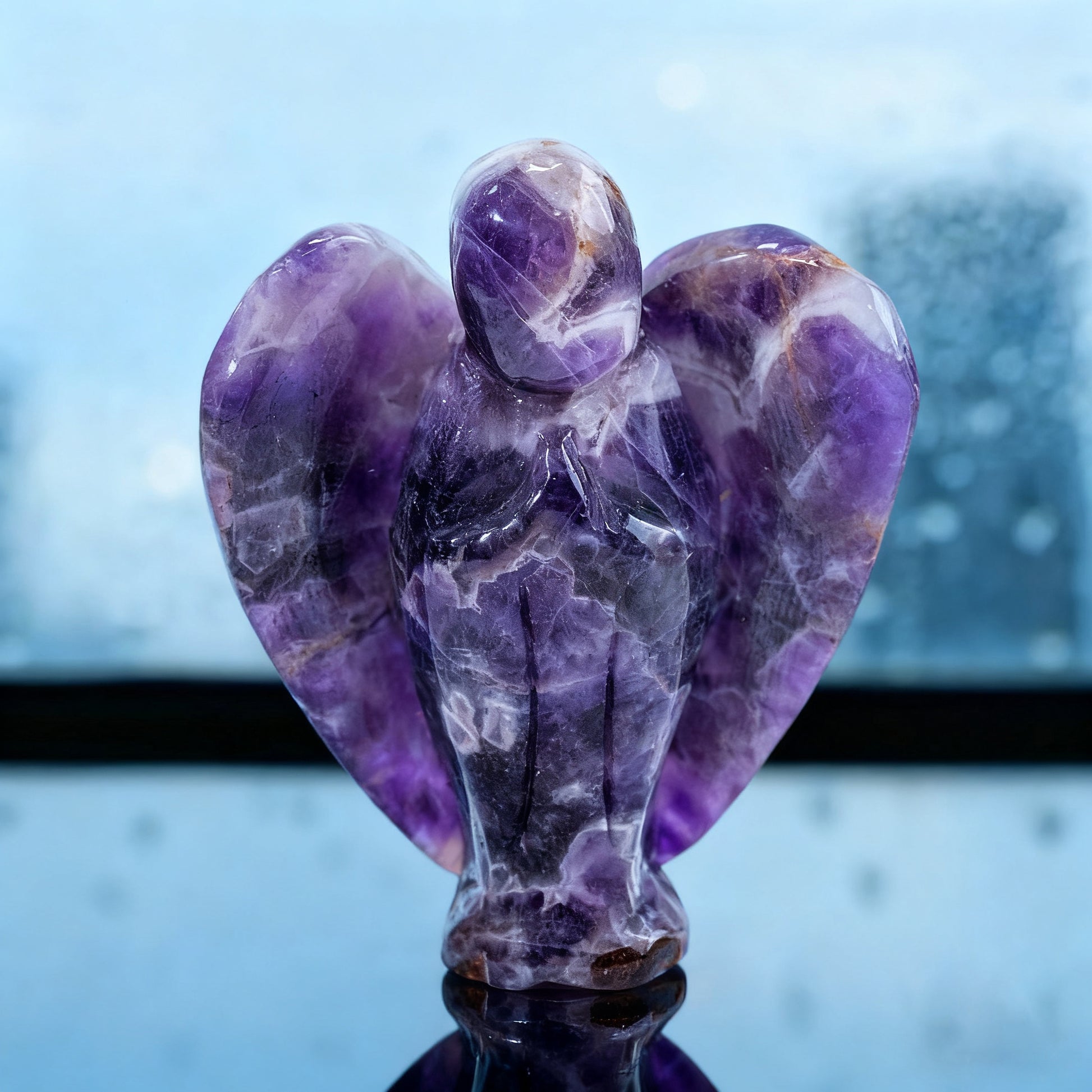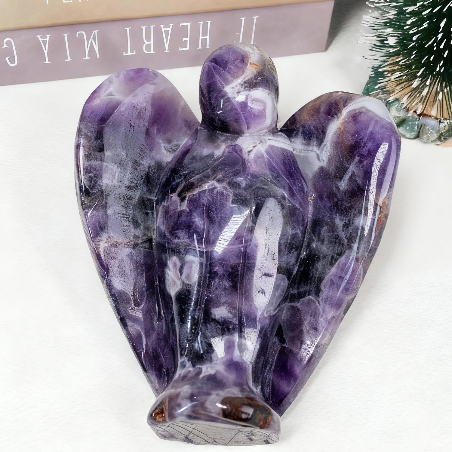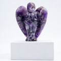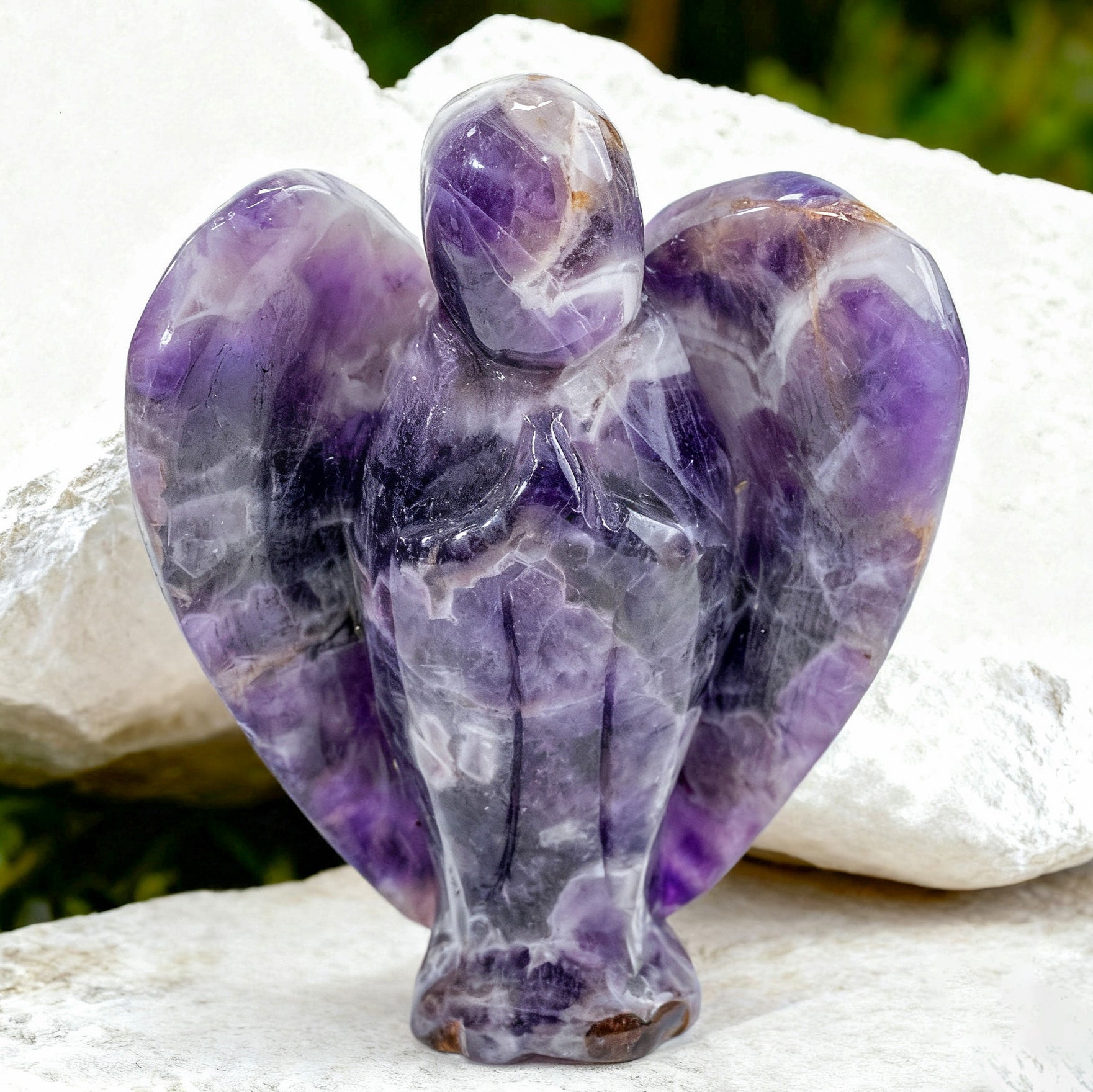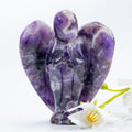 This elegant Dream Amethyst angel carving weighs approximately 0.88 lbs and is beautifully hand-carved from natural dream amethyst. Featuring soft purple tones with flowing white band patterns, each angel displays unique natural textures that highlight the character of the stone. The detailed carving and smooth polished finish give this piece a graceful and timeless appearance.