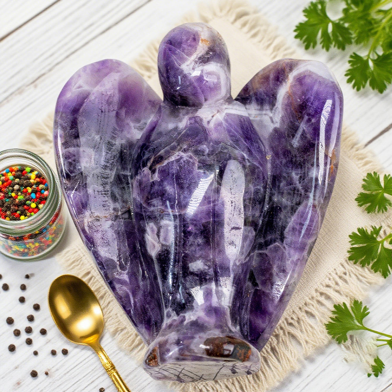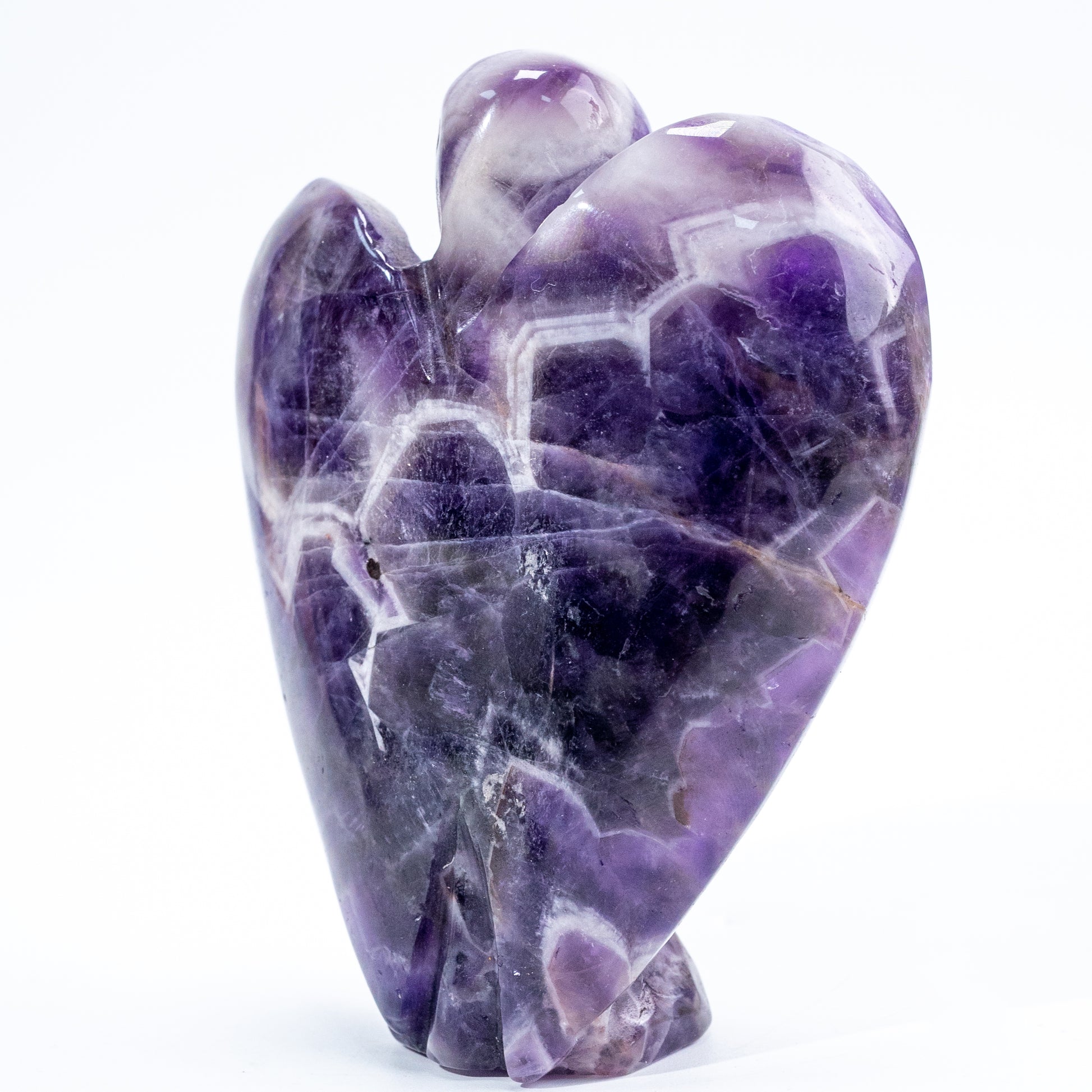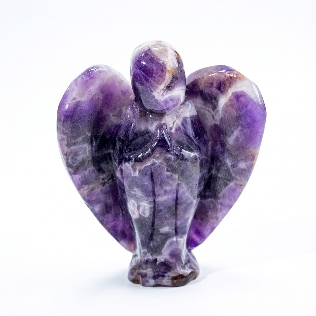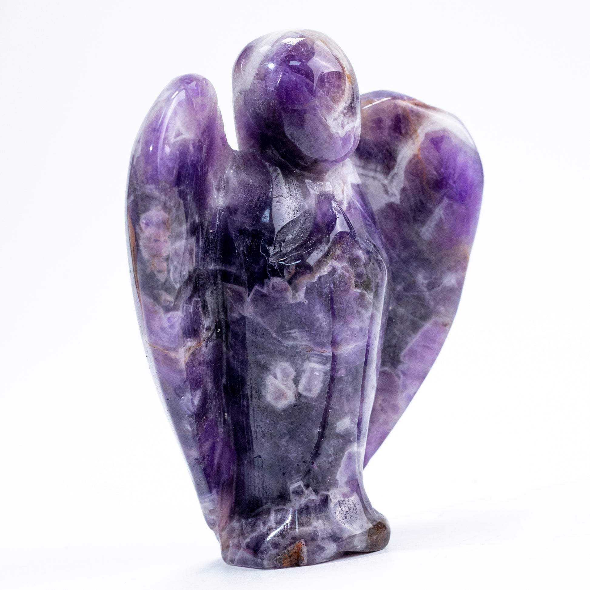 This elegant Dream Amethyst angel carving weighs approximately 0.88 lbs and is beautifully hand-carved from natural dream amethyst. Featuring soft purple tones with flowing white band patterns, each angel displays unique natural textures that highlight the character of the stone. The detailed carving and smooth polished finish give this piece a graceful and timeless appearance.